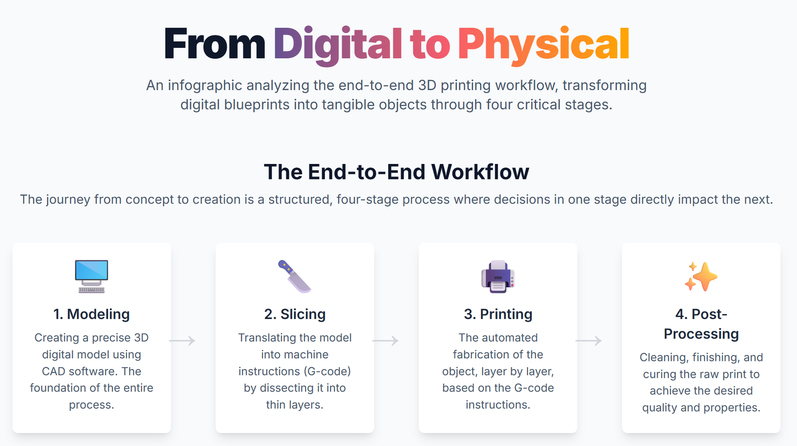 Additive manufacturing, commonly known as 3D printing, represents a paradigm shift in the creation of physical objects, transforming digital blueprints into tangible items with unprecedented speed and geometric freedom. This report provides an exhaustive analysis of the end-to-end 3D printing workflow, a multi-stage process that begins with conceptualization in a digital environment and culminates in a finished, functional component. The journey from intangible data to physical reality is navigated through four critical stages: Modeling, Slicing, Printing, and Post-Processing. Each stage presents a series of technological choices and trade-offs that directly influence the quality, cost, and performance of the final product.