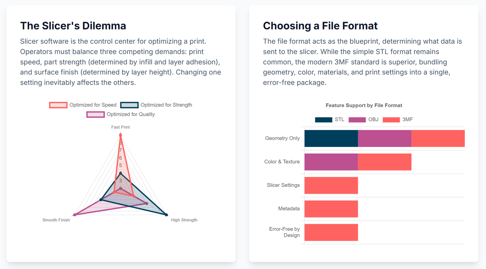 This was not a significant limitation in the early days of 3D printing, when machines could only print with a single material in a single color. However, with the advent of modern multi-material and multi-color printers, the inability of the STL format to carry this richer data has become a major bottleneck.22 Furthermore, the format is prone to errors such as holes, gaps, and overlapping triangles, which can result from a poor conversion process and often require manual repair before a model can be successfully sliced.22