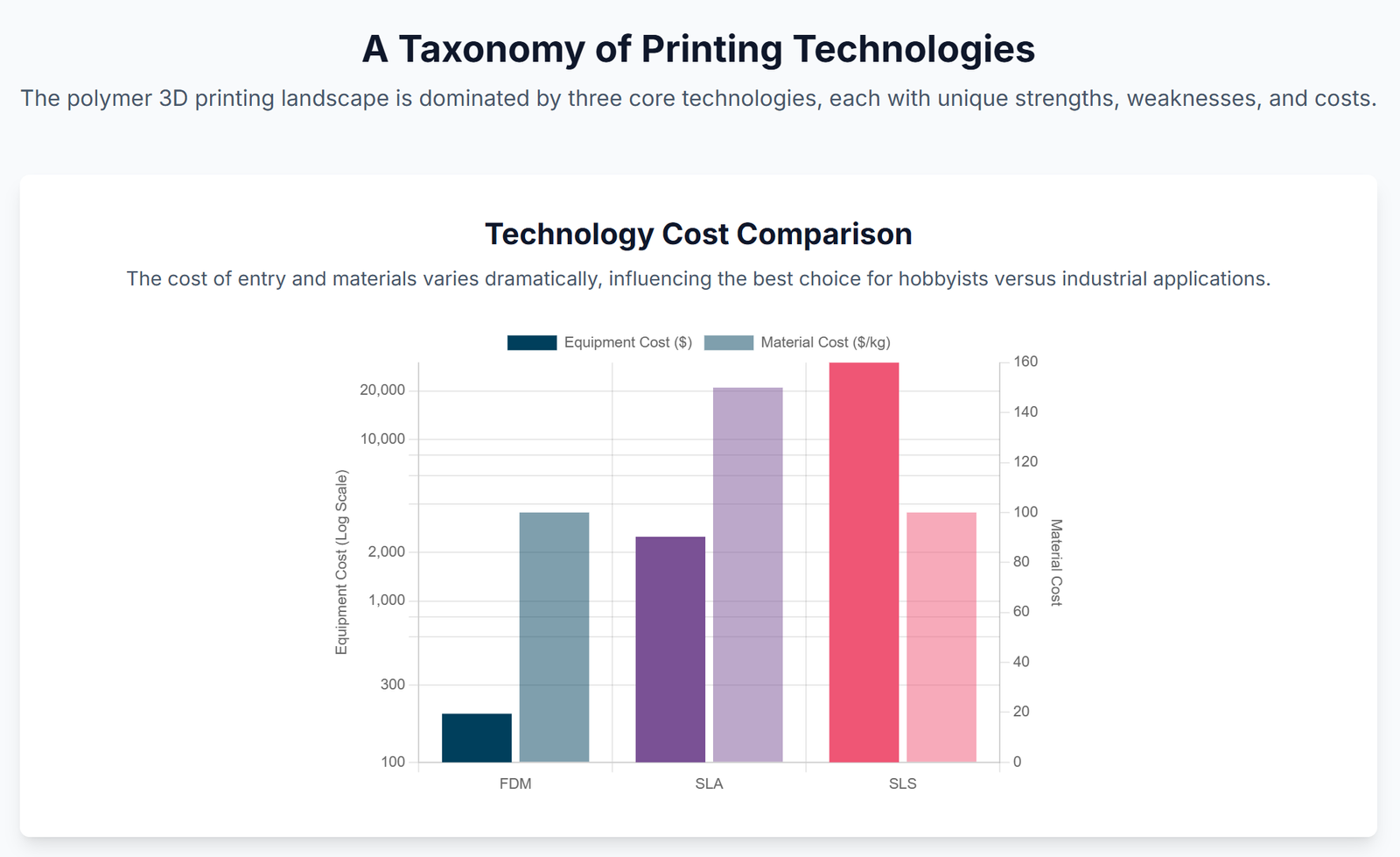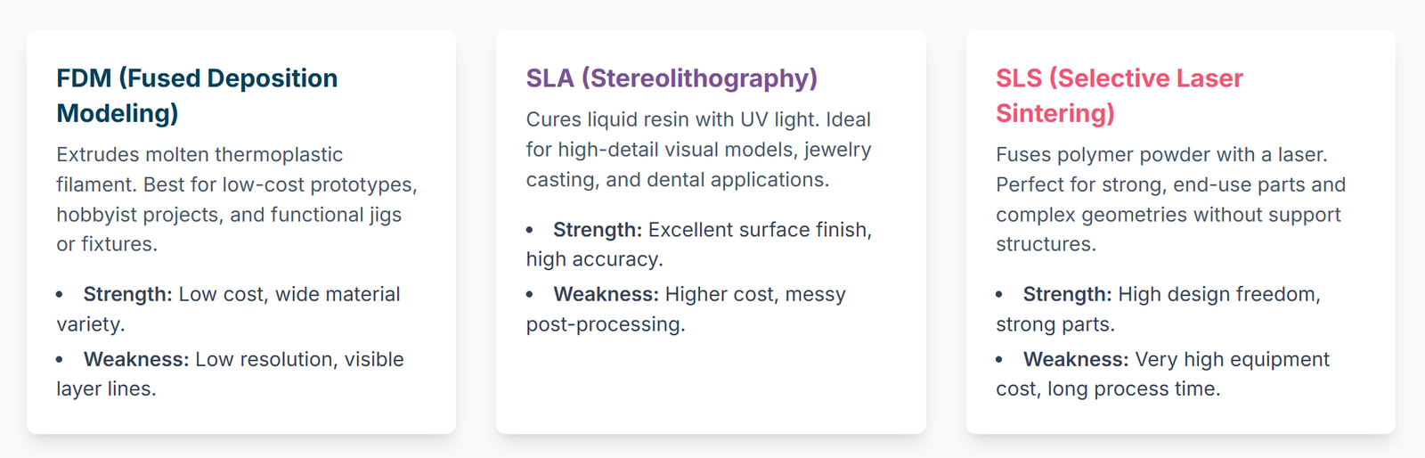 The term "3D printing" encompasses a variety of distinct processes, each with its own method for building objects layer by layer. While numerous technologies exist, the polymer-based additive manufacturing landscape is dominated by three primary methods: Fused Deposition Modeling (FDM), Stereolithography (SLA), and Selective Laser Sintering (SLS). The choice of technology is one of the most consequential decisions in the workflow, as it dictates everything from material compatibility and part resolution to mechanical performance and post-processing requirements.16