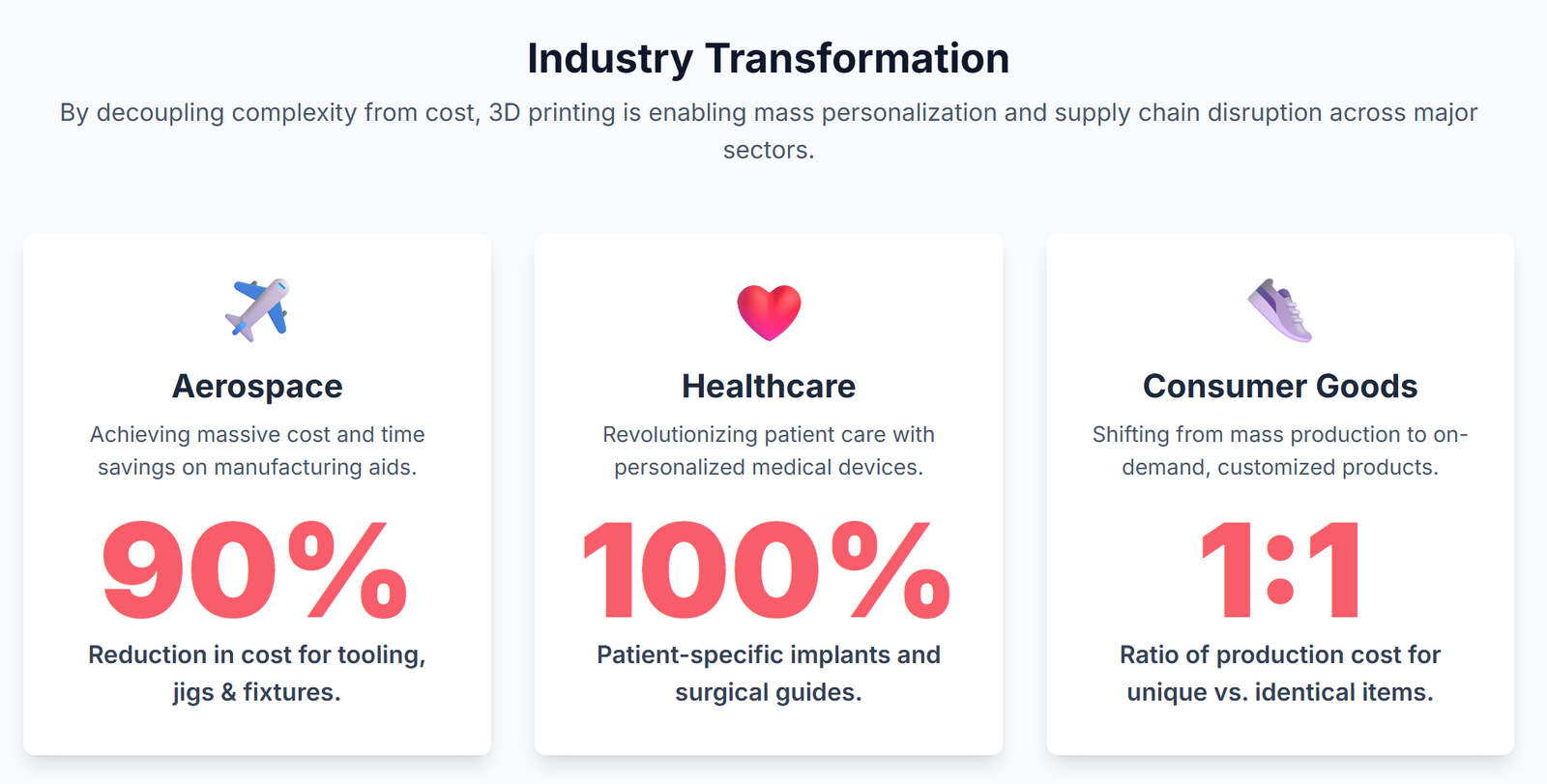 The true impact of 3D printing is measured by its ability to solve real-world problems and create value in various industries. By fundamentally altering the relationship between design, manufacturing, and cost, additive manufacturing is not just an alternative production method but a catalyst for innovation. Its core value proposition—the decoupling of geometric complexity from manufacturing cost—enables a paradigm shift from the mass production of standardized goods to the mass personalization of tailored solutions. This capability is driving transformative changes in sectors as diverse as aerospace, healthcare, and consumer goods.